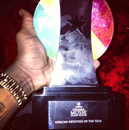The young artiste who beat P-Square, Iyanya, and Davido to win African Artist of the Year excitedly posted this photo of his award via instagram, we say congrats to him!
