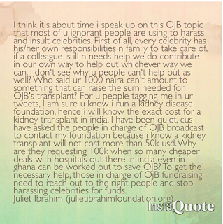 I don’t see why u people can’t help out as well? Who said our 1000 naira can’t amount to something that can raise the sum needed for OJB’s transplant? For you people tagging me in your tweets, i’m sure you know I run a kidney disease foundation, hence I know the exact cost for a kidney transplant India.”