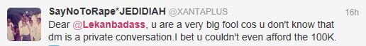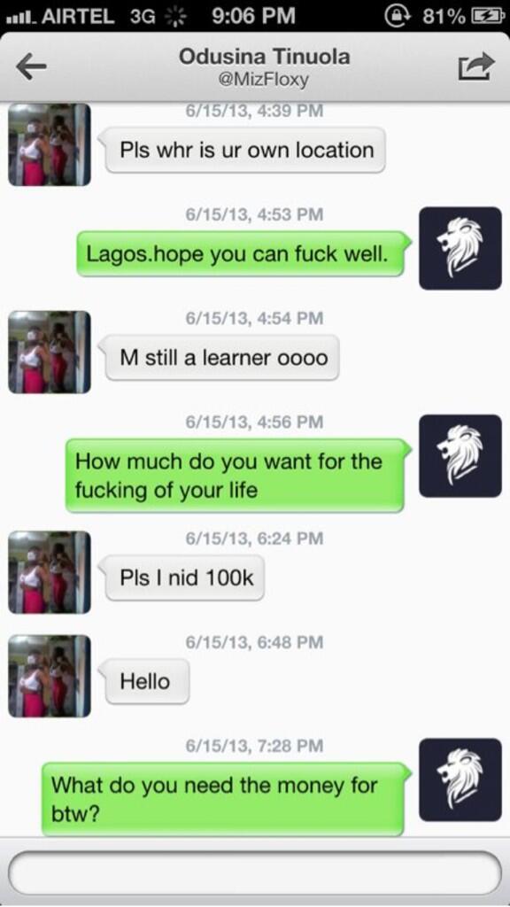 A certain @MizFloxy needed some money because she was broke so she sent a private message to one of her contacts @Lekanbadass.