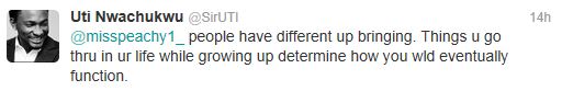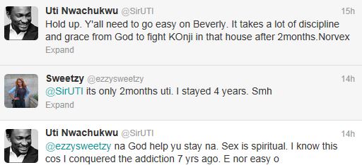 Big Brother star, Uti Nwachukwu responded to questions posed at him on his twitter page on Saturday after the current Nigerian representative, Beverly was involved in a sexual escapade with a fellow housemate.