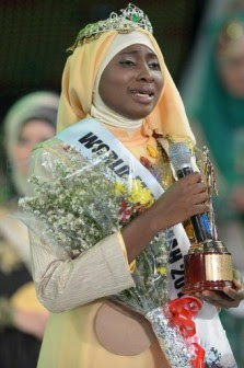 A Nigerian, Obabiyi Aisha Ajibola, tearfully prayed and recited Koranic verses as she won a world beauty pageant exclusively for Muslim women in the Indonesian capital Wednesday, a riposte to the Miss World contest that has sparked hardline anger.