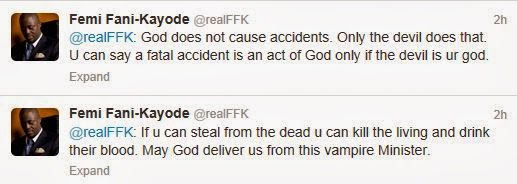 Fani Kayode who’s not impressed with the minister’s statement took to twitter a few hours ago, calling her a vampire for saying “the plane crash is an act of God”
