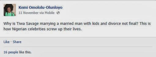 Former Governor’s daughter, Kemi Olunloyo, known for always stirring up controversies via her face book page and twitter handle, wants to know why singer Tiwa Savage is getting married to an already married man, Tee Billz, who is yet to be divorced.